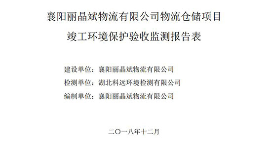 襄陽麗晶斌物流有限公司 襄陽麗晶斌物流有限公司物流倉儲項目 竣工環(huán)境保護驗收公示 根據(jù)《建設(shè)項目環(huán)境保護管理條例》(國務(wù)院令第682號)和《建設(shè)項目竣工環(huán)境保護驗收暫行辦法》的有關(guān)規(guī)...